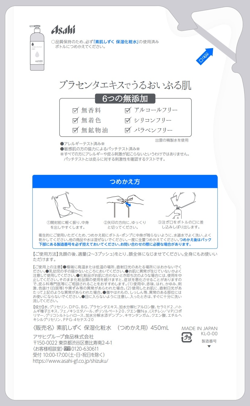[36個]アサヒグループ食品 素肌しずく 保湿化粧水 つめかえ用 450mL | 【プラセンタでたっぷり保湿】