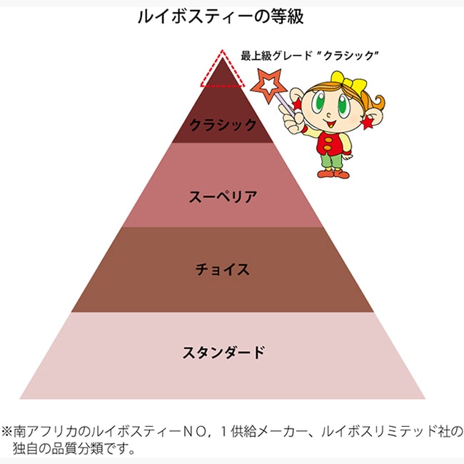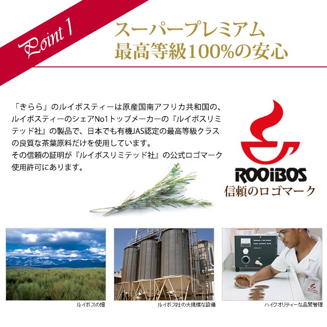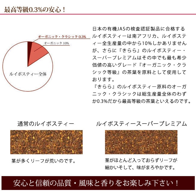 きららのルイボスティー原料のオーガニック・クラシックは総生産量全体のわずか0.3%。さらに、茶葉には、茎が一切入っていない、とてもきめ細かい茶葉のみのお茶なんです。なのでコクの高い風味とマイルドな味わいが実現されています。