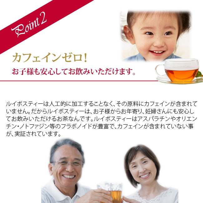 ルイボスティーは人工的に加工することなく、その原料にカフェインが含まれていません。だから、お子様からお年寄り、妊婦さんにも安心してお飲みいただけるお茶です。またアスパラチンやオリエンチン・ノトファジン等のフラボノイドが豊富に含まれています。
